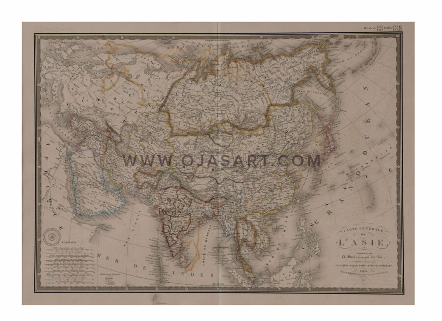 This large map of Asia features detail of major cities, political boundaries, rivers, and mountains. The map extends south to include parts of Sumatra and Borneo, and the western coastline of Alaska and the Aleutian islands appear at top right. The map is surrounded by an elegant keyboard-style border